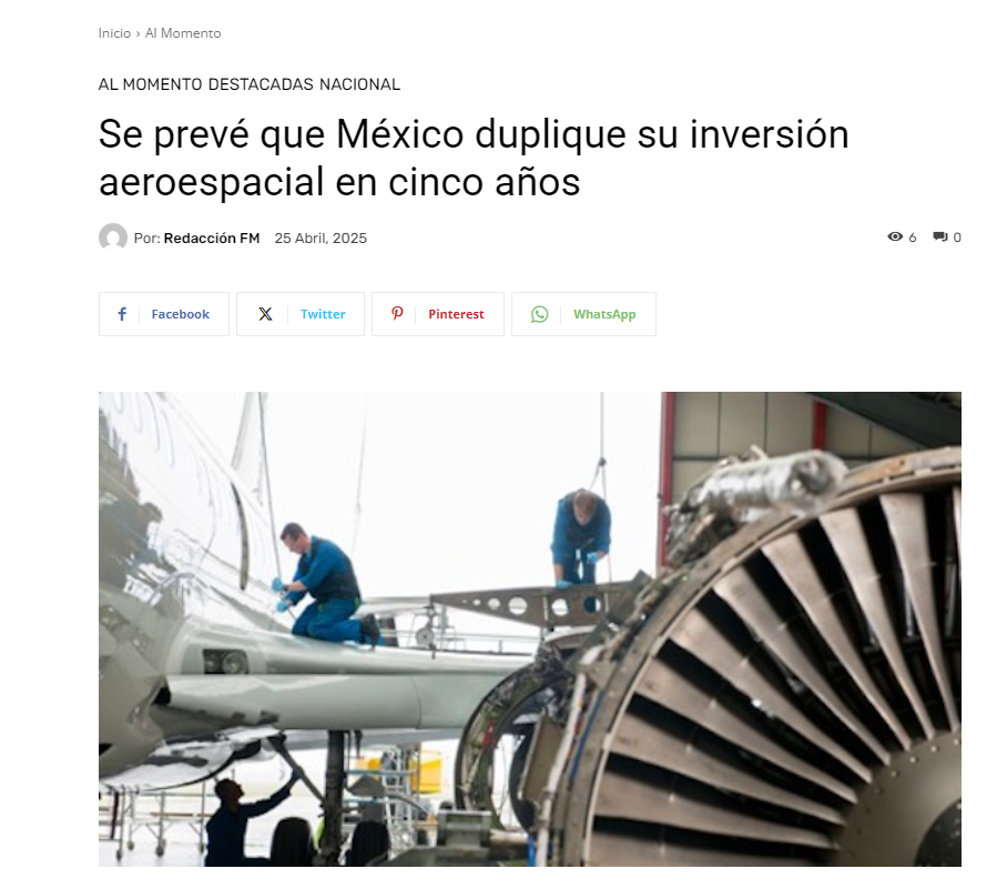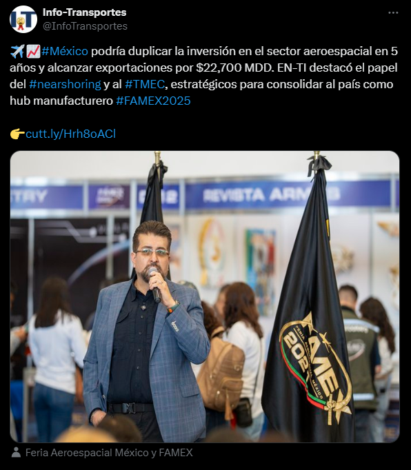 Durante la Feria Aeroespacial México (Famex) 2025, Óscar Mora Velázquez, director de la empresa EN-TI, dijo lo anterior y anticipó que el sector crecerá un 15%, alcanzando exportaciones por 22,700 millones de dólares...